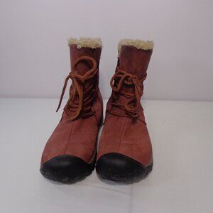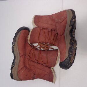 The Keen Women's Brighton Suede Leather Faux Fur Low Boots in Burgundy Size 6.5 are stylish and comfortable boots perfect for casual occasions during the winter season.