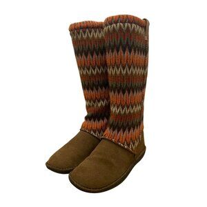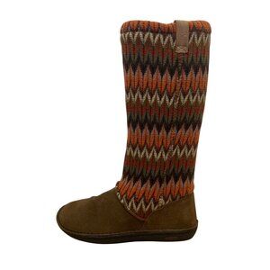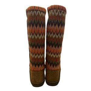 Cozy knit boots featuring a multicolor zigzag pattern and a suede footbed for casual wear. Durable rubber sole ensures support and style. Size EU 39 (US 8.5).
