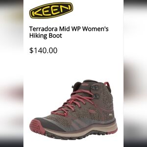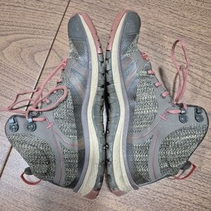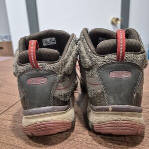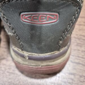 Stylish lace-up boots by Keen. Durable design with red accents. Perfect for outdoor adventures.