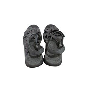 These are preowned the Keen Women's Rose Sandals in gray. These sandals have it all. They are designed with non-marking rubber outsoles that have a multi-directional lug pattern for enhanced control on various surfaces, including wet terrain. The hook-and-loop closure system allows for a secure and customized fit. These are versatile hybrid sandals suitable for trail walking, water activities like kayaking, or casual everyday wear.