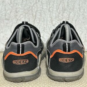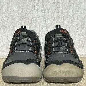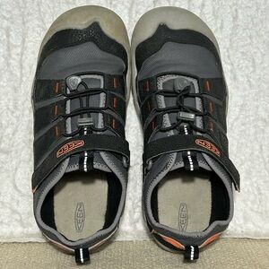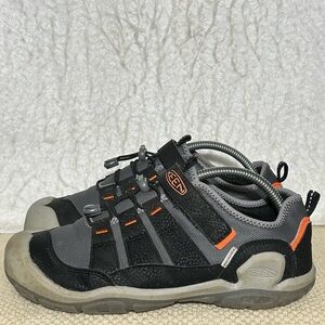 Keen Youth Black Knotch Hollow Comfortable Wrap Mesh Leather Sneaker Shoes. Color: Black/Grey/Orange. Pre-owned – refer to pictures for description of shoes. No rips or tears. Smoke free.