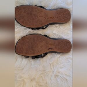 These are beautiful black soft genuine leather slip on sandle size 10 womens gently used condition