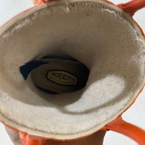 Keen rain boots in a little kids size 4. Orange floral pattern on the sides. Waterproof and fleece lined. Pull on straps. Soles are in great condition with tons of life left.