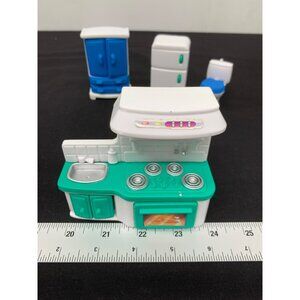 This mini dollhouse furniture set includes a plastic armoire, toilet, refrigerator, and kitchen stove. All parts are removable for easy rearranging, providing endless fun for your little ones.