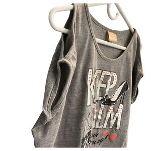 💖 Keep Calm And Love Shopping Gray Graphic Cutout Shoulder Top – Size M
