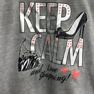 Show Off Your Fun And Fashionable Side With This Gray Keep Calm And Love Shopping Graphic Top! Featuring A Playful High Heel And Heart Print, Plus A Stylish Cutout Shoulder Design. This Lightweight Tee Is Perfect For Casual Outings, Shopping Trips, Or Lounging In Comfort.