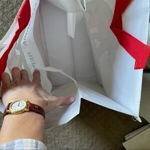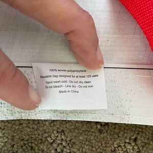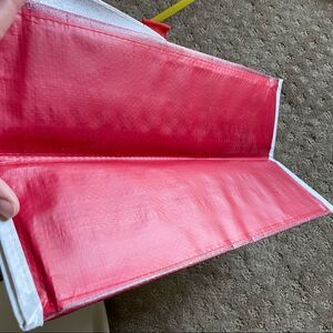 This bag is in like new condition, has never been used, just stored. It has a couple of wrinkles from storage. The material is very firm and sturdy, the handles are solid and will allow to carry a good weight. Inside, on opposite sides, are heavy duty holders for bottles (or baguettes, or flowers!) let me know if you have any questions!