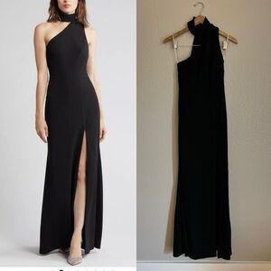 Maxi Dress, you're bound to keep people on their toes with your style! This alluring dress is composed of stretchy techno crepe knit that shapes a high halter neck (with a double button closure) and two asymmetrical cutouts that accent the front and the back of the darted bodice. A figure-skimming column skirt, with a sultry thigh-high slit, falls from a high fitted waist before ending at a floor-sweeping maxi hem. Hidden back zipper/clasp.
