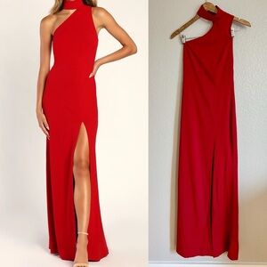 Lulus Keep It Interesting Red Asymmetrical Cutout Halter Maxi Dress, you're bound to keep people on their toes with your style! This alluring dress is composed of stretchy techno crepe knit that shapes a high halter neck (with a double button closure) and two asymmetrical cutouts that accent the front and the back of the darted bodice. A figure-skimming column skirt, with a sultry thigh-high slit, falls from a high fitted waist before ending at a floor-sweeping maxi hem. Hidden back zipper/clasp.
