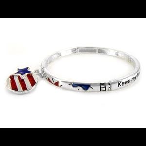 A 3/4" red, white and blue enameled patriotic charm accents this silvertone stretch bracelet, engraved with the words "Keep my husband safe."