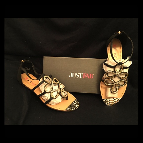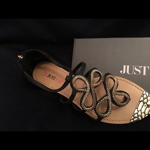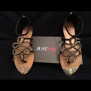 Brand new. Never worn. Black and gold snake weave patterned gladiator sandals. Box included.