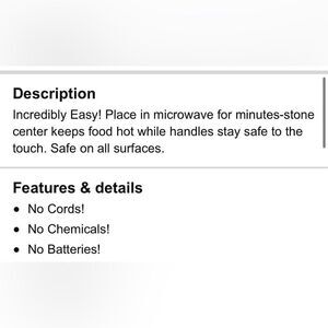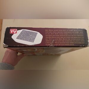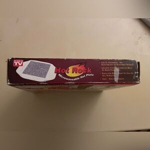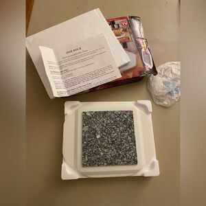 Hot Rock microwaveable hot plate . Keeps food hot throughout your entire meal. Solid granite core transfers heat to dish . No cords , chemicals or batteries. Never been used . Box is not perfect but hot plate is. Smoke free / pet friendly home