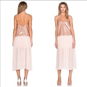 NWT! Beautiful rose gold/blush pink dress. Sequined bodice with a loose fitting top. Partially lined skirt with a sheer overlay. Zip and keyhole button back.