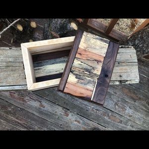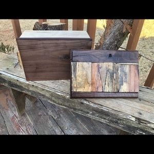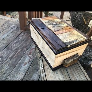 Beautiful keepsake box custom made with walnut and spalted maple inlayed on bottom and lid. Spalted maple handles complete the design. Very unique piece.