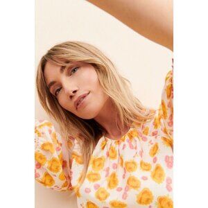 This beautiful Keepsake dress is perfect for any occasion, whether it's a garden party or a cocktail event. The dress features a lovely floral pattern in shades of yellow and porcelain rose, with a crew neckline and short puff sleeves. The A-line fit and flare style is flattering and comfortable, while the midi length makes it suitable for any season.