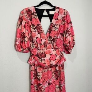 Floral, puffy sleeve and wide leg. Sizer closure, open back.