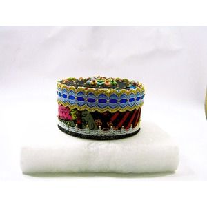 About 3 inch tall x 5 wide. This box has a fun uplifting message printed on the inside is super colorful and has a fun mini journal created with blank handmade papers dyed or unusual sheets for writing ideas and memories. The box is covered with vintage fabric pieces, old jewelry and rhinestones. These charming boxes are designed to not only store your precious items but also to add a touch of fun to your space I have several styles - please check out my store!