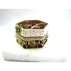 I make these Keepsake jewelry trinket storage boxes with refurbished and re-purposed materials that generally consist of vintage fabric, jewelry, gemstones ribbon, repurposed old cards and anything else I can find! For these reasons each box is one of a kind!