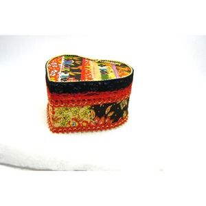 About 4 inch tall x 5 wide. The box is covered with vintage fabric pieces, old jewelry and rhinestones. These charming boxes are designed to not only store your precious items but also to add a touch of vintage elegance or fun to your space I have several styles - please check out my store!