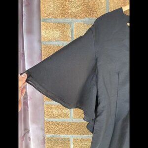 The All Yours mini dress in black from Keepsake the Label, size large Minimalism never felt so dramatic! Straight cut simple v-neck dress with large layered ruffle winged flutter sleeves. Black with subtle sheen. Back zip, fully lined. 70/30 Rayon/Poly blend - no stretch.
