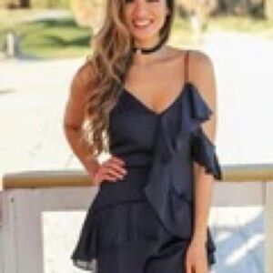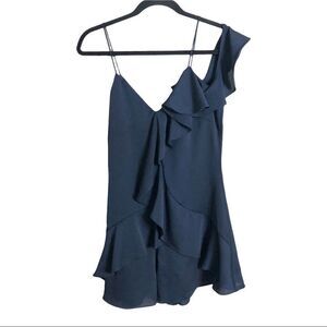 Keepsake Navy Blue Spaghetti Strap Ruffle Romper. Size Medium. 98% polyester 2% elastane. Back hidden zipper. Spaghetti straps with one hanging sleeve. Fully lined. Excellent used condition!