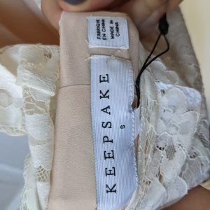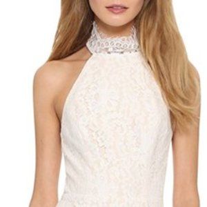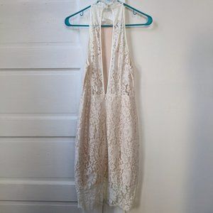 This Ivory dress was never worn, but perfect for a bridal shower or engagement shoot. It has a high lack neckline and open slit in the back. The neck closes with two buttons. The lace is ivory/white and the liner is beige which pokes through. Size small. The neck needs to be ironed, but other than that perfect condition.