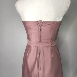 Beautiful pink Effortless Midi Strapless Dress from Keepsake. Large pleated design. Removable belt. Great wedding guest dress. It does zip up all the way, our model was a bit bustier than the dress allowed. One thread belt loop is broken and there is a snag and dark spots on an area on the hem as shown in the last photos. 50% cotton 50% polyester