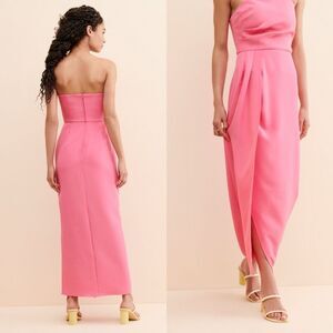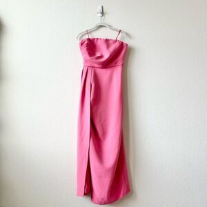 Strapless gown that falls right at the ankle w/ a slit overlay for an added dimension