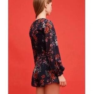 Keepsake The Label Navy Blue Floral Romper Playsuit in a size S. In excellent “like new” condition. Hidden back-zip closure V-neck Long sleeves with button cuffs Partially lined. Elegant women's dress featuring a stunning floral pattern. Perfect for any occasion. Length is 28 1/2” and waist is 13”.