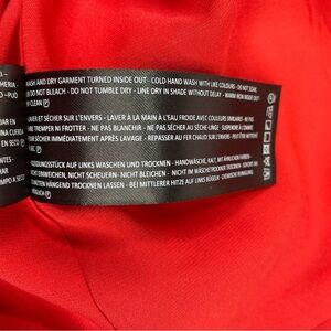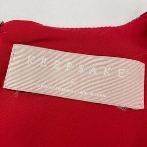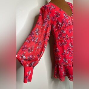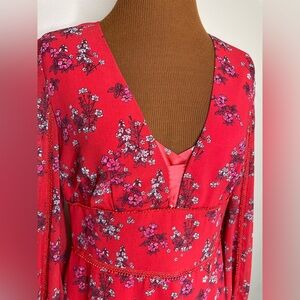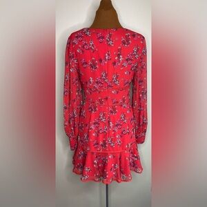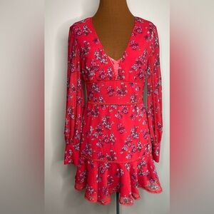Long sleeved KEEPSAKE the Label dress features a vibrant red and pink color palette, perfect for a wedding guest or cocktail occasion.