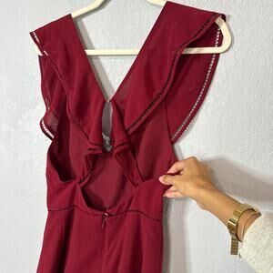 It is a maroon romper featuring ruffle and flounce details, open eyelet details, an open back, and a criss-cross back with button and hidden closures