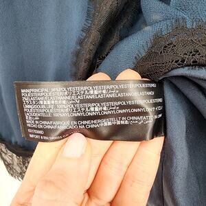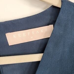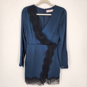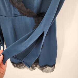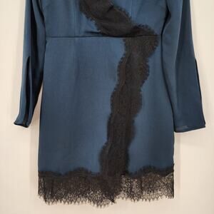 Keepsake The Label Mini Dress M Satin Lace Trim Long Flare Sleeve Blue Black
