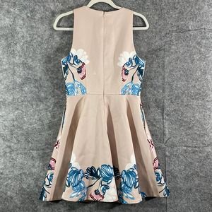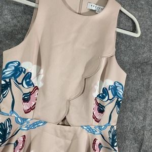 Features: pale pink mini dress, floral print, round neck, sleeveless, A-line silhouette, full pleated skirt, scalloped detailing at the bodice with center cutout, back zipper