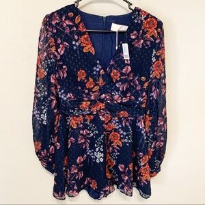 Keepsake The Label "Need You Now" navy blue floral motif swiss dot flouncy romper playsuit. Long sheer puff sleeves. Zips up back. Fully lined. 100% polyester.