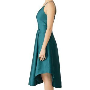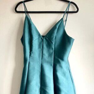 Teal satin (100% Polyester). Full skirt. Sleeveless. V-neckline. Exposed back zipper closure. Fully lined. From RTR