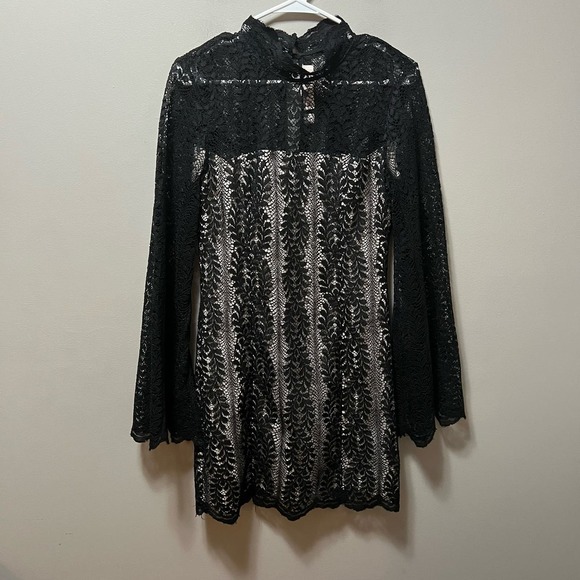 A classy occasion calls for the Keepsake Uptown Black Lace Dress! Lovely black lace forms a mock neck and sheer decolletage atop a nude liner. Sheath bodice is framed by sheer bell sleeves. Back keyhole with two button top closure. Hidden back zipper/clasp.