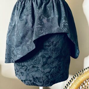 In very good gently used condition. Classic little black dress with a twist. The asymmetrical peplum skirt is so fun and unique. Jacquard black floral design. Deep open v neck back with hidden zipper. Cap sleeves. The hanging strings were cut off as shown. Size medium.