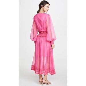 This boudoir-inspired Keepsake midi dress pops with bright pink color, and feels free and easy in gauzy chiffon. Princess sleeves combined with a smocked waist give this silhouette a nice balance of voluminous and formfitting elements