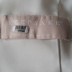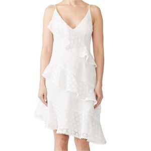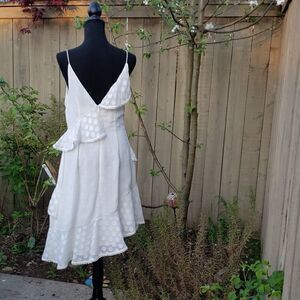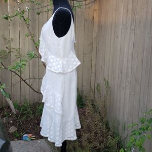 White chiffon (93% Polyester, 7% Viscose). Hourglass. Sleeveless. V-neckline. Hidden back zipper closure. Fully lined. 39" from shoulder to hemline. Imported.
