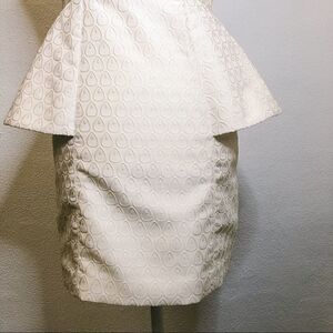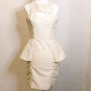 Adorable little dress by keepsake the label, size XS.  This dress features a beautiful cream colored jacquard fabric, cut out high neckline, and peplum detail.  Dress has been gently worn, with small stain noted to back of dress on threads (see photo); otherwise good condition.