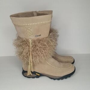 Tan suede moccasin winter boots. Italian design. Outside features real goat fur. Tassel accents. Acrylic wool lining. Side zipper. Rubber traction outsole. Has some wear and minor scuffing from gentle use (see pictures).