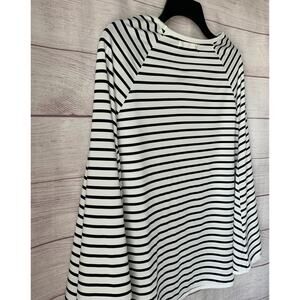 White with black horizontal strips nursing cover by Kefee Kol. This breastfeeding cover-up resembles a poncho. It has a round neckline and a single pocket on the front. It is pre-owned and in great condition.