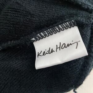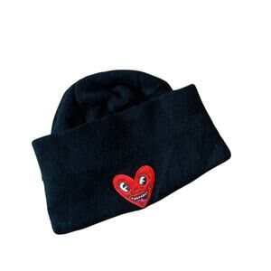 Keith Haring Black Rolled Knit Beanie Hat Embroidered Laughing Heart Unisex
