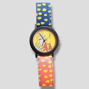 Rare collectible wristwatch featuring Keith Haring’s iconic pop art design — white rabbit with red figures on a bright yellow dial. Colorful patterned strap with yellow dots on blue and pink.