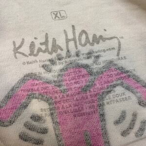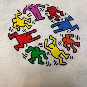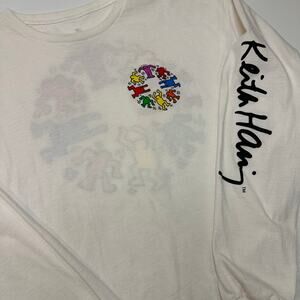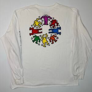 Keith Haring White Cotton Screenprint Tee. Left chest Loni and full back art. Left sleeve logo. 100% cotton. Some faint piling in underarms, see photo. Mens size XL Extra Large.