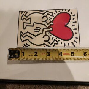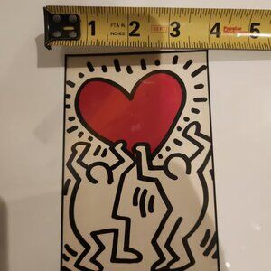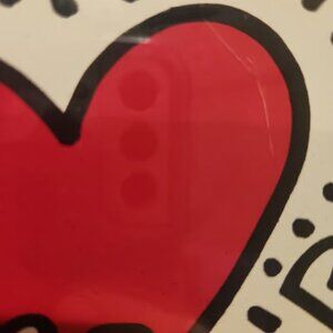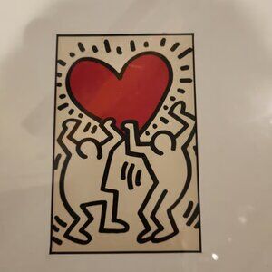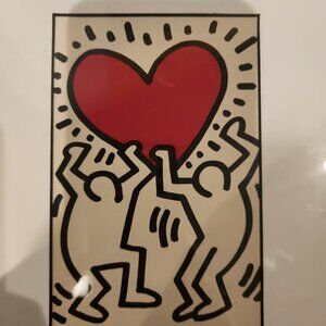 Artwork: This piece features Haring's signature style of bold outlines and energetic figures, showcasing two figures holding a radiating red heart.