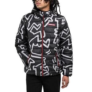 This reversible puffer jacket from Members Only x Keith Haring boasts red, white, and grey graffiti graphics over a black colorway on both sides for an edgy, artsy look. This comfortable outerwear is made of 100% polyester, offering full zip closure, a fixed hood, and dual hand pockets for any items that you'll want to keep close.