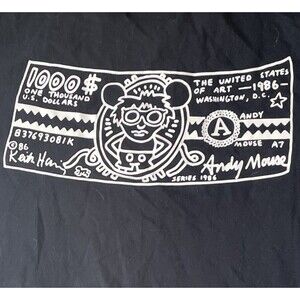 The back graphic is of a drawing by Keith Haring of fake $1000 bill with a mouse named Andy mouse.