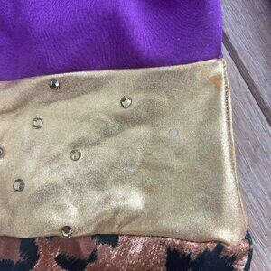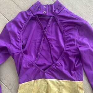 Kelle Purple, Gold, and Cheetah print long sleeve leotard with silver buckle