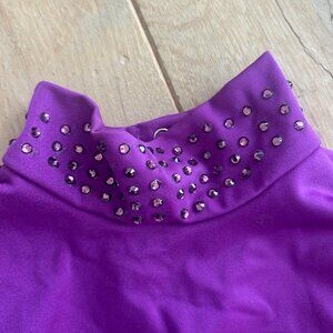 Leotard has been bedazzled on collar and belt.